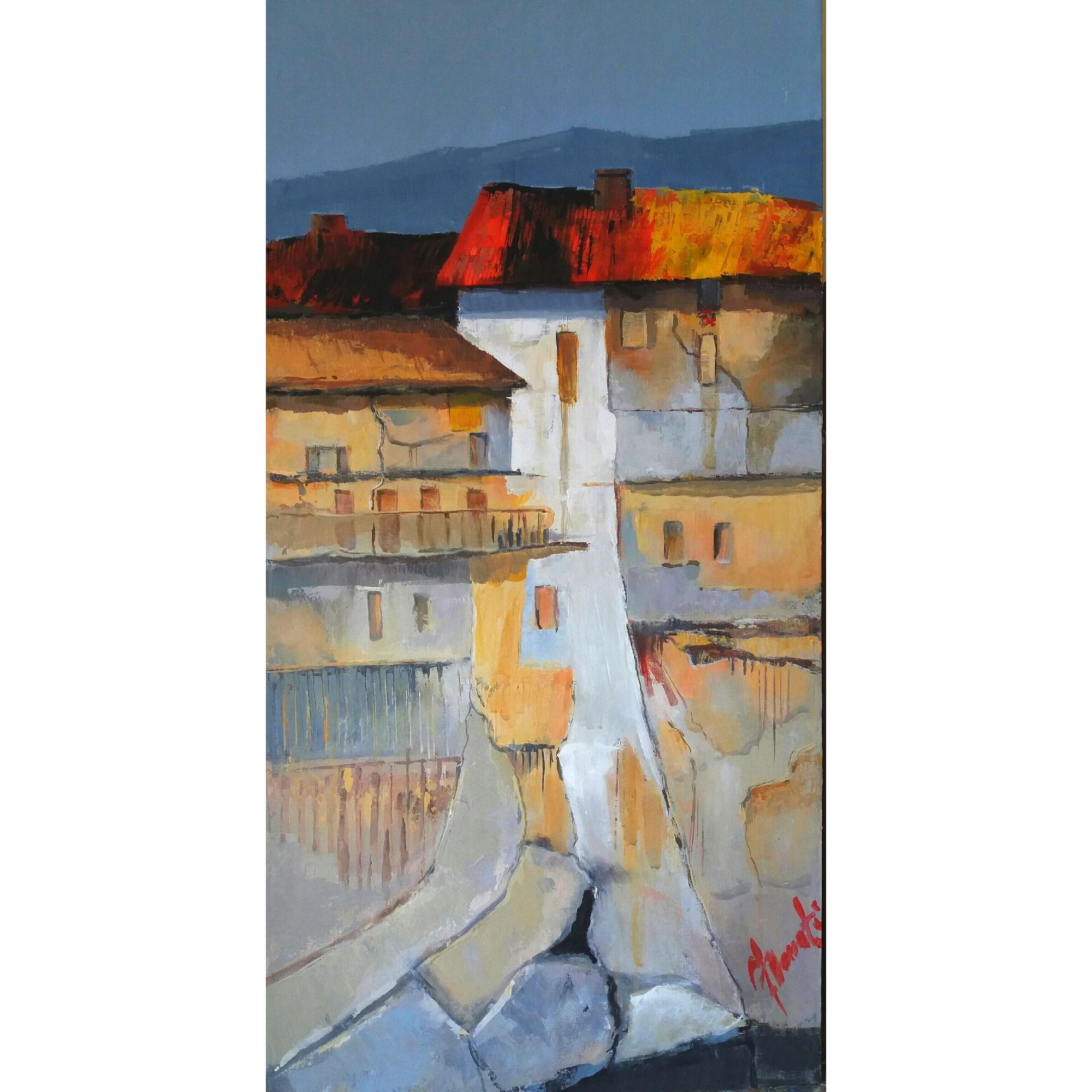 Inizialmente crea un'opera figurativa, (dipinto disponibile) successivamente desidera conferirgli un aspetto più moderno, la seziona in tre parti e ne estrae tre opere astratte, quella qui rappresentata è la seconda.